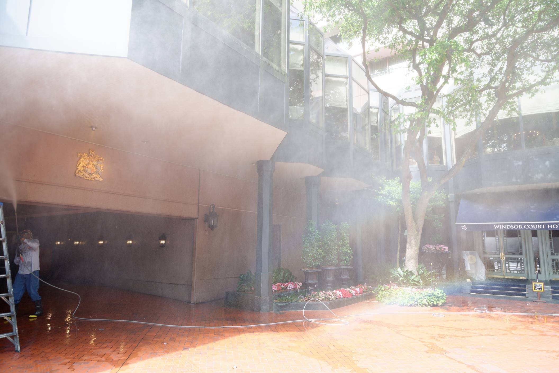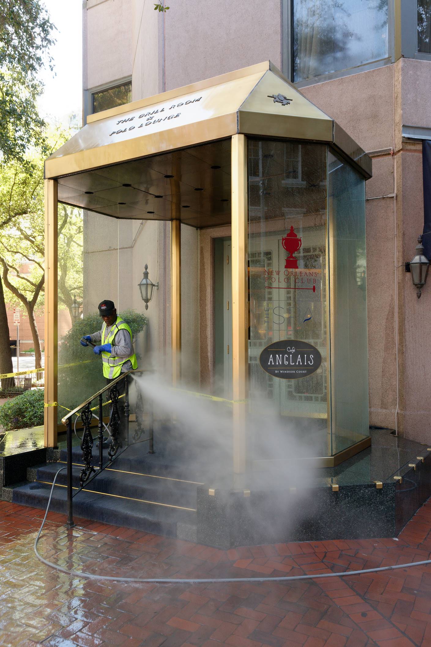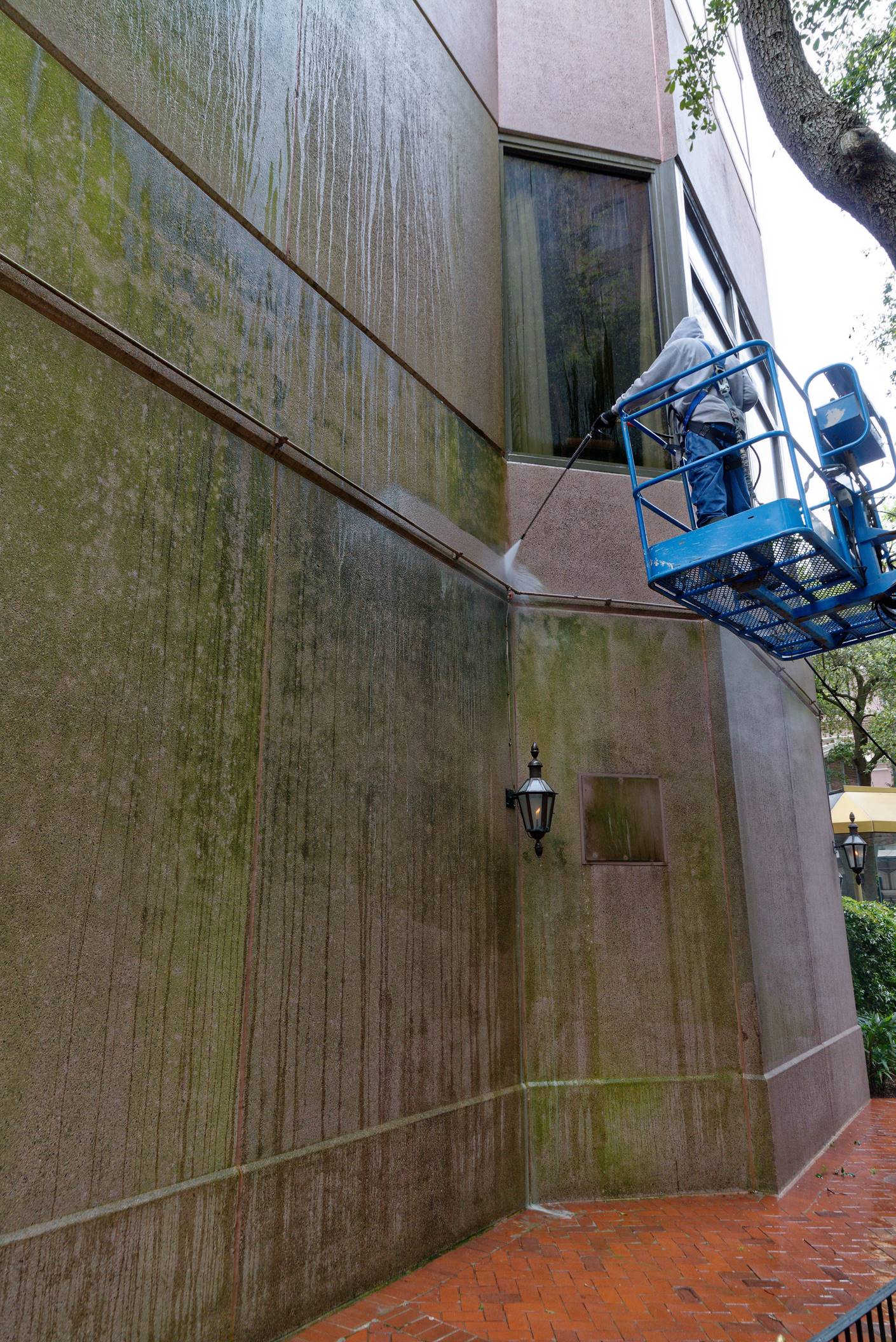 Presoaked building facade with an out door bleach and Prosoco cleaning solution. Utilize two hot water pressure washers to wash around the entire hotel building and garage to remove all mold and mildew and atmospheric staining from building facade up to second level.